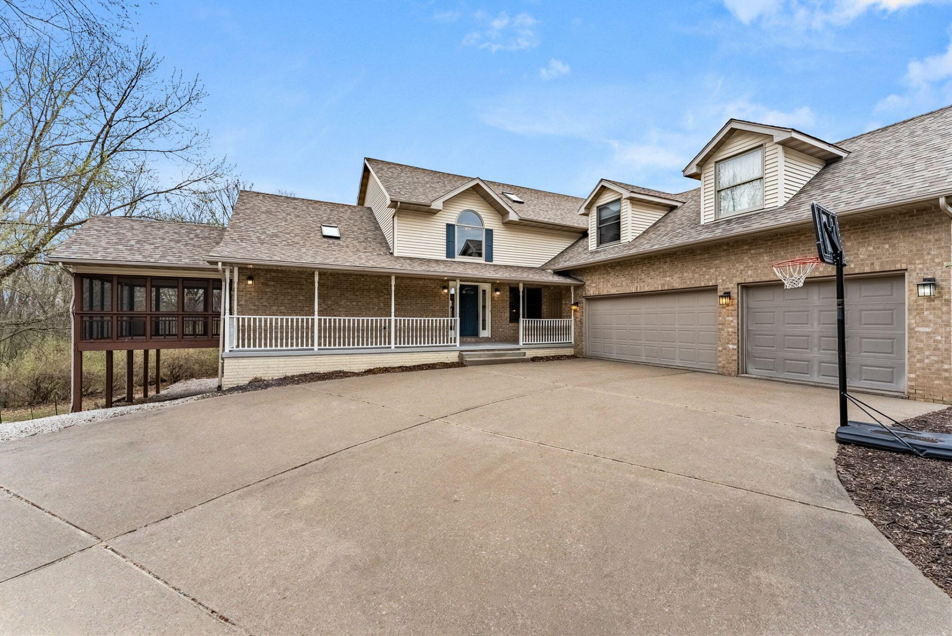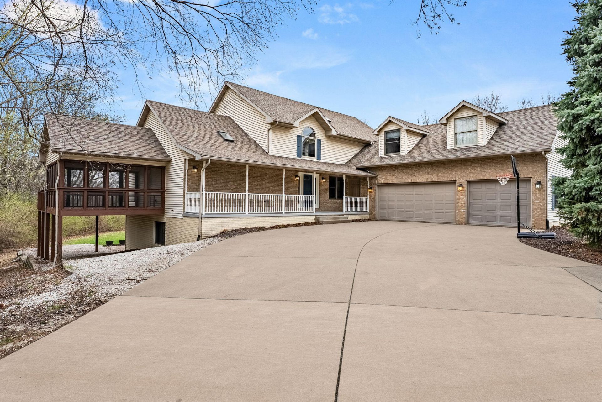 Quality built, one owner home! This property sits on almost 2 acres with mature trees and great curb appeal! Impressive 2 story foyer and family room featuring a brick fireplace and tall windows overlooking the yard. Main floor primary bedroom with access to a screened porch. Newly remodeled primary bathroom with freestanding soaking tub. Updated kitchen offering granite tops and plenty of room for cooking and entertaining. Upstairs you'll find three bedrooms (one without a closet) and a loft overlooking the family room. One unique feature about this home is the ''in-law'' suite in the lower level. This level offers a full kitchen, 2 bedrooms, bath and family room with fireplace. There is a ramp in the garage for wheelchair access or drive below and enter through the walk out. Great home!