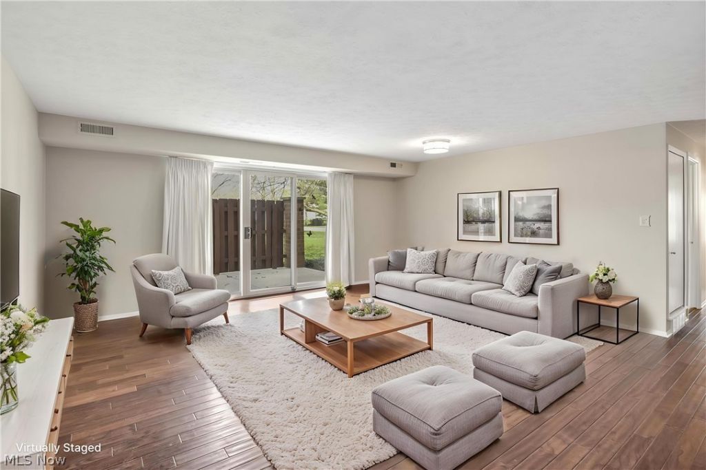 Prepare to be moved! Welcome to this charming condo in desirable Olmsted Falls. Enjoy peaceful living in a tranquil, park-like community surrounded by mature trees and rolling green hills. This 2-bedroom, 2-bathroom condo offers 1,125 square feet of comfortable living space and is ideal for first-time homebuyers or anyone seeking convenient single-level living. Step inside to a bright and airy main living area filled with natural light. Large sliding glass doors lead to your private enclosed patio, perfect for morning coffee or relaxing evenings outdoors. The pass-through breakfast bar connects the living area to the kitchen, creating an open layout ideal for entertaining. The kitchen features sleek stainless steel appliances, including a flat-top range and built-in microwave, complemented by rich espresso cabinetry offering ample storage. Enjoy the convenience of in-unit laundry tucked neatly behind classic bi-fold doors for a clean, streamlined look. Both bedrooms and bathrooms are located on the main level. The spacious primary bedroom offers generous closet space, while the second bedroom is perfect for guests, family, or a home office. Additional highlights include your own private detached garage. Just a short walk, enjoy the community pool surrounded by lush landscaping and mature trees. The beautifully maintained common grounds feature expansive green space, shade trees, and a charming picnic area, perfect for outdoor gatherings. A serene pond with a central fountain creates a picturesque setting for peaceful walks. Recent updates included Lighting, interior paint, and bedroom carpet (2026). Conveniently located near highways, shopping, and dining, and about 2025 minutes from Downtown Cleveland. Located just minutes away from park that offer scenic trails, covered bridges, and waterfalls along the Rocky River. Don't miss your chance to make this condo your own! Cats alowed but no dogs