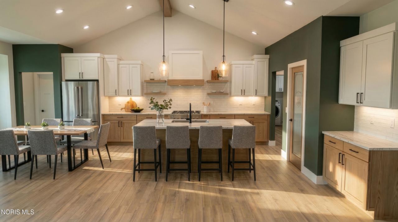 This home was designed, interior-designed, and built by award-winning and high-end custom builder, Homes by Josh Doyle. This new construction custom home offers the highest level of structural quality and energy efficiency. Features include ½ closed cell spray foam exterior walls with fiberglass batt insulation & R-50 ceiling insulation (perfect for rising energy costs!), 4000 PSI concrete w/ fiber mesh foundation walls, premium-grade studs and OSB, and top-tier basement drainage and waterproofing systems. This quality is un-matched in the industry for spec homes. The layout is a perfected 'master class' custom home design specifically for this lot. NOT COOKIE CUTTER. Learn more about the quality on the How We Build page of their website. Contact directly to do a 3D walk-through of the home to visualize interior finishes and layout in a virtual meeting or in-person at HQ in Whitehouse, Ohio. Location / Lot This residence is situated in the highly sought-after Winterbourne subdivision in Monclova, OH. Located in Monclova TWP means no local city taxes! These lots are 195' deep which is plenty of room for entertaining, hobbies, a pool, or just being really far away from your neighbor! Layout This spectacular split ranch single floor home offers an incredible open-concept floor plan designed for effortless living and entertaining. Right off the welcoming entryway, you will find a private den. The heart of the home features a large kitchen that flows directly into a stunning great room and a bright sunroom, both feeling massive thanks to soaring cathedral ceilings. The primary suite is tucked away for privacy on one side of the home, featuring a large walk-in closet and a master bathroom designed for relaxation with dual sinks, tiled shower, and a large soaking tub. On the opposite side of the home, the home features 2 additional bedrooms with their own separate and private hallway, connected bath has double sink vanities & private tub/shower/toilet room. Completing the layout is a dedicated mudroom and a separate laundry room located just off the everyday entrance from the three-car garage. Finishes EXTERIOR: Premium black windows with a front top-grid pattern, an elegant front door, and crisp white long-panel garage doors! Beautiful premium siding with board-and-batten accents on the front is perfectly contrasted by gorgeous stone wainscot accents across the front elevation. Custom stained cedar gable trusses, stained cedar porch columns framing the front porch, and a dimensional shingle roof make this home look VERY custom! INTERIOR: Inside, a breathtaking kitchen awaits with stunning two-tone cabinetry, gleaming quartz countertops, sleek matte black hardware, and a stained wood door with frosted glass leading to a walk-in pantry. Entertaining is a joy around the spectacular gas fireplace, featuring a beautiful stone surround, a custom stained mantle, and painted shiplap all the way to the ceiling. A stunning custom stained wood beam hi
