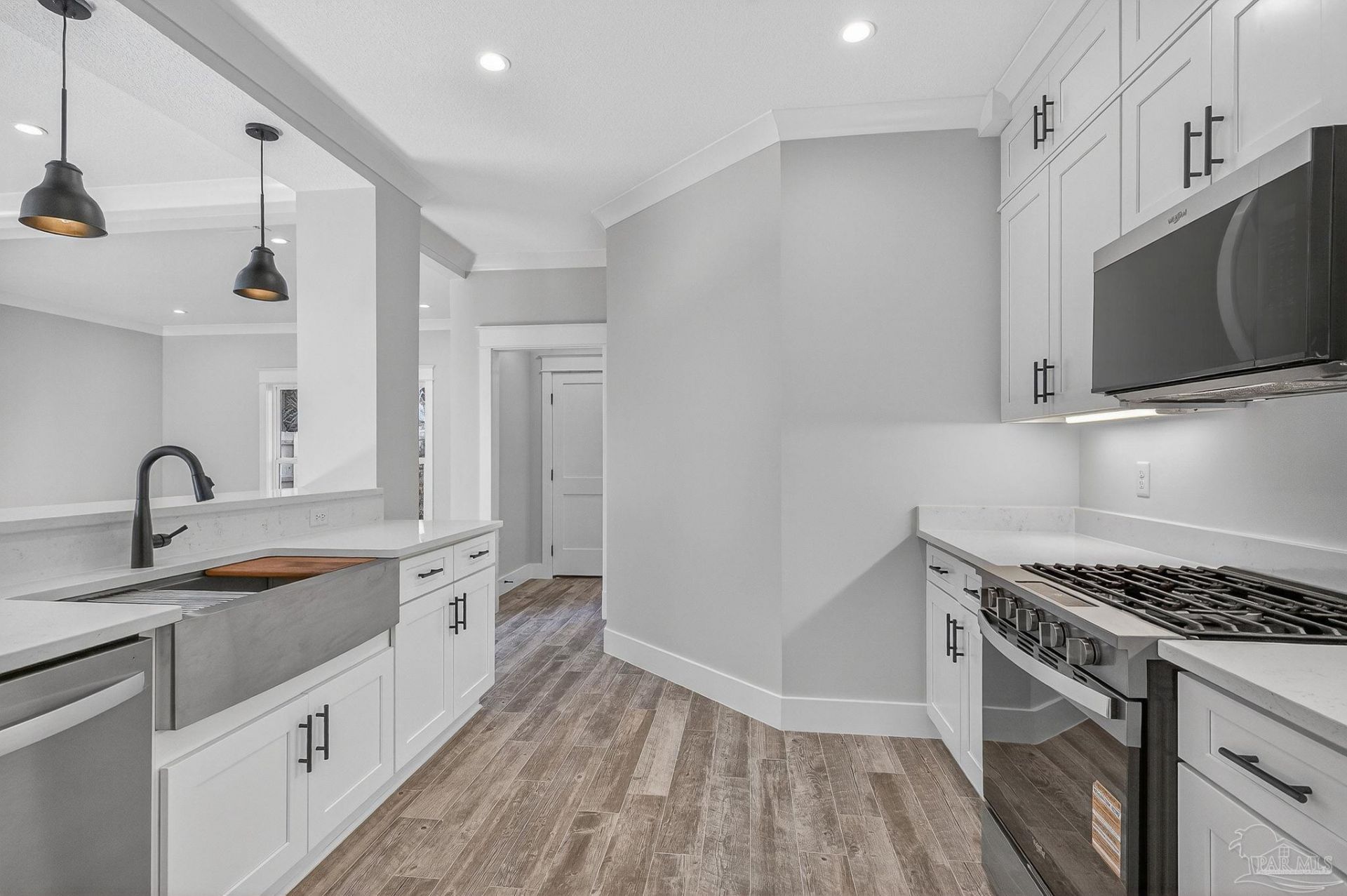 This newly built home is conveniently situated just minutes from local shopping and dining options, including a grocery store, bakery, bistro, and more. It offers a charming coastal vibe and is only a short drive to downtown Pensacola and Pensacola Beach. The inviting paver driveway leads up to the house and the side-entry two-car garage. Under the covered front porch, you'll find the main entrance, which welcomes you with plenty of natural light and high ceilings. The open concept living room and kitchen are on the main floor, along with the primary suite, a full guest bathroom with a tile wall shower, a guest bedroom, and a laundry room. The kitchen features modern white cabinets, quartz countertops, a stainless steel gas range, refrigerator, dishwasher, and a full pantry with built-in shelves. Both the kitchen and living room have wood-look tile plank flooring. The primary suite offers a spacious bedroom with a tray ceiling and soft ambient lighting, tile flooring, and peaceful views of the lush backyard trees. The primary bathroom includes a double vanity with quartz countertops, a relaxing free-standing tub, and a beautiful tile shower with a frameless glass door. It also provides two closets for plenty of storage. Upstairs, there's a full bathroom with a tile wall shower, two additional bedrooms, and a versatile bonus room with a linen closet. The South-facing upstairs bedroom has a partial water view of the Bay. The roof and exterior walls feature upgraded insulation. Out back, you'll find a privacy fence, an open patio, and vibrant landscaping that offers both sound dampening and privacy. Additional features include impact-resistant windows and front door, a tankless gas water heater, and yard sprinkler system. Schedule a showing to see this home today!