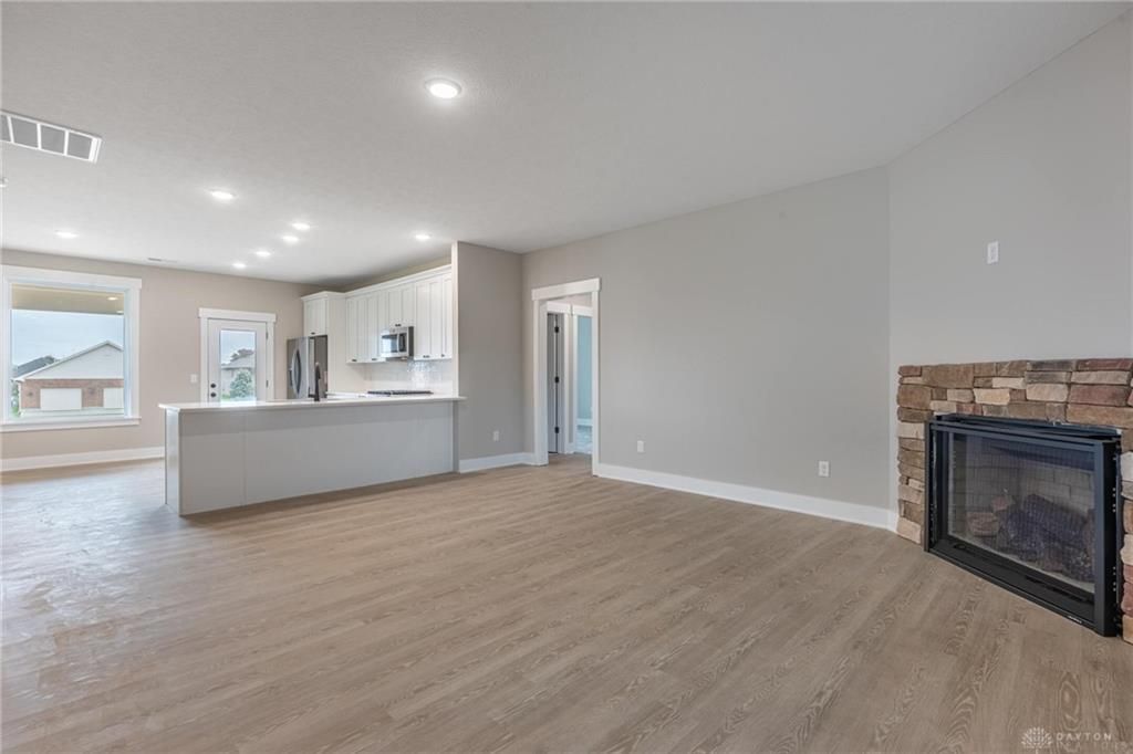 Brilliant design in Xenia's popular Wright Cycle Estates neighborhood! There's no wasted space in this beautiful brick and Hardie ranch featuring a full three-car garage! From the covered front porch, the angled entry provides privacy from the street. Inside, enjoy the front-to-back WIDE OPEN living space with stone-wrapped, oversized corner gas fireplace. The kitchen features beautiful, high-end white cabinetry with soft-close doors and drawers and pantry closet. Don't miss the stainless appliance package featuring a gas range! The dinette area is light and bright thanks to an oversized fixed-pane window and glass patio door. The Primary bedroom is nicely sized and complimented by an ensuite bath; including a double-basin vanity, custom tile and glass (to be installed) shower, private commode room and generous walk-in closet! Split from the Primary, the other side of the home includes two generously sized guestrooms with laundry room between as well as a full bath. Relax away your evenings on the 17x10 covered rear patio with northern exposure. The extra-deep lot provides nice separation from the homes to the rear. Additional amenities include: Four-sides brick ~ Premium garage doors ~ Hardie trim ~ Full-width driveway ~ 95% efficient gas furnace ~ Mission-style trim package ~ Deep tub ~ Fully sodden yard. This home is NEARLY COMPLETE and ready for you!!